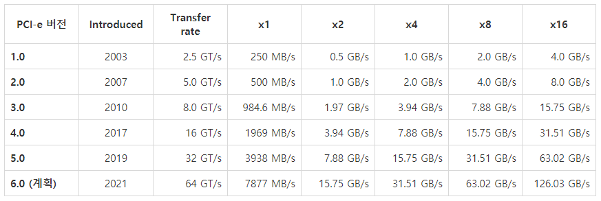 참고로 PCI-e는 하위 호환성이 있으므로 높은 버전의 PCI-e라고 해도 낮은 버전의 PCI-e에 꼽아서 작동시킬 수는 있다. 속도는 낮은 버전을 따라간다.