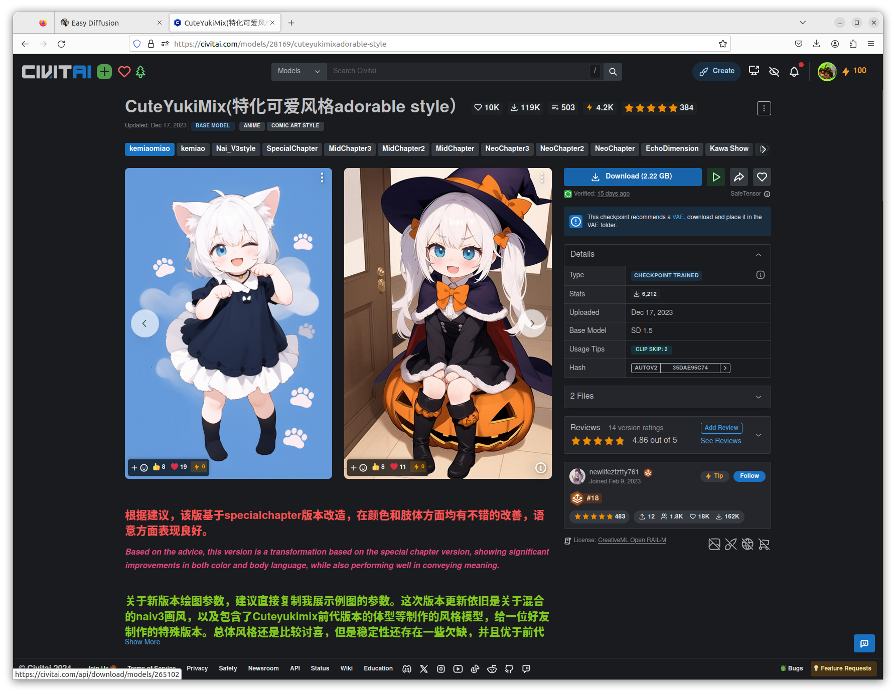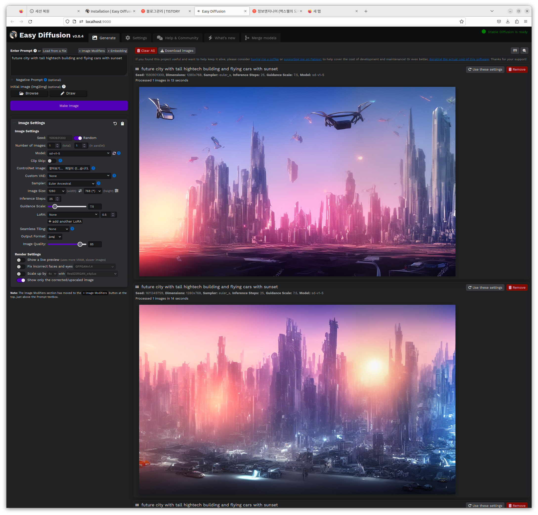 이렇게 디폴트로 사용하는 방법도 있지만 custom model을 다운로드 받아 사용하는 방법도 있다. civit.ai 같은 사이트에서 model 파일을 다운로드 받아서 ./easy_diffusion/models/stable-diffusion/에 넣은 후 아래와 같이 특화된 이미지를 생성할 수도 있다.