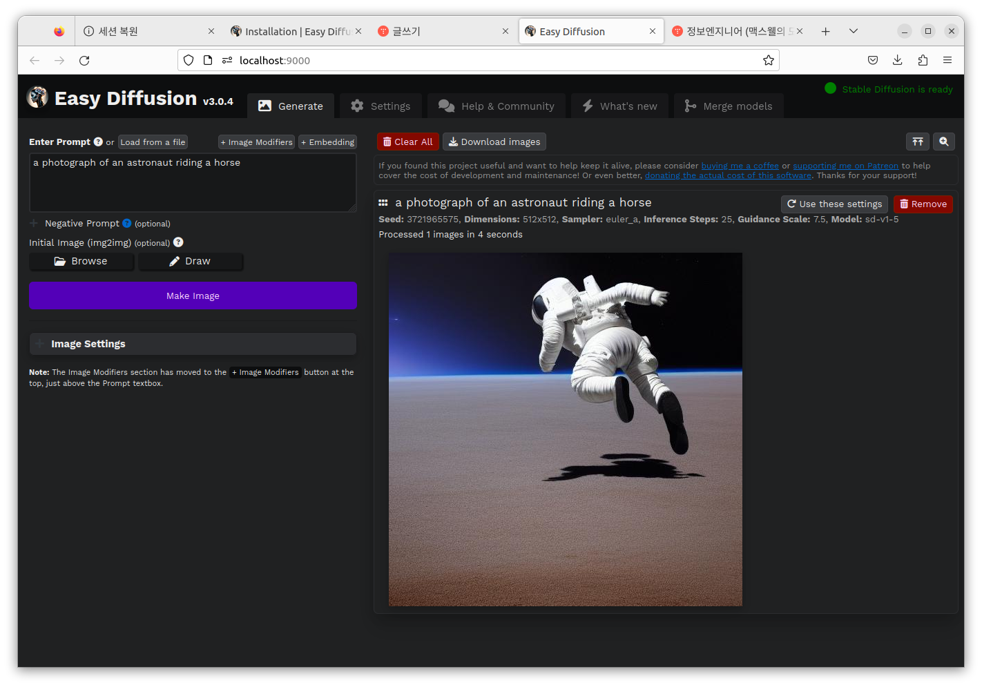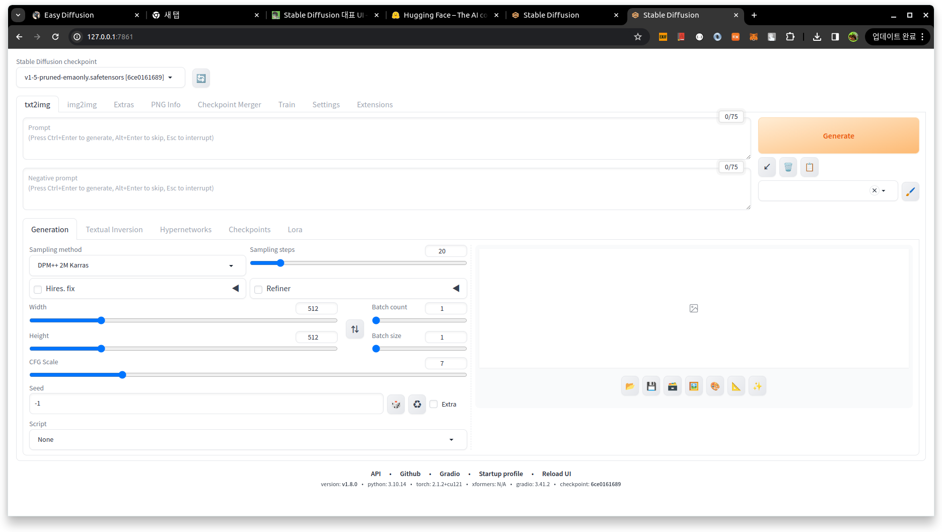 생성형 이미지의 대표주자인 Stable Diffusion을 설치해서 실행해보자. 많은 것들이 그간 발전했고 easy diffusion이라는 멋진 웹인터페이스까지 만들어진 오픈소스가 존재한다.