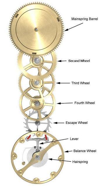 톱니바퀴에 의한 계산기부터 살펴보자. 가장 간단한 것은 덧셈이다. 5+6=11이라는 것은 누구나 암산 할 수 있지만, 이것은 사람의 뇌의 힘을 빌어서 할때는 그렇다. 기계적으로 이 덧셈을 하려면 어떻게 할까? 가장 손쉽게 설명할 수 있는 것이 바로 "기계식 시계"이다. 기계식 시계는 세상에서 가장 오랫동안 개선 되어온 톱니 계산기 중의 하나이다. 60초는 1분이며 60분이 1시간이 되는 기본 구조를 가지고 초침과 분침이 돌며 숫자를 가리킨다. 즉, 60초가 되어 톱니가 한바퀴 돌면 더 큰 톱니를 움직여 1분을 더해주고, 그 1분이 60분이 지나 결국 더 큰 톱니를 조금더 움직여 1시간을 나타낸다. 60진법 덧셈 계산기인 것이다. 아래가 그 태엽에서 시작된 동력이 어떻게 초/분/시가 연결되어 나타내지는 보이는 구조이다. 각 축에는 시침,초침,분침이 연결된다. 맨 상단의 메인 스프링통이 돌면서 첫번째 휠이 아주 천천히 돌 것이고(시간), 그 정확한 비에 의해서 다음 휠이 그 다음 속도로 돌고, 또 그 다음 휠이 그 다음 속도로 된다. 그 비율은 1:60으로 고정되어 있다. 맨 하단에는 이 휠이 일정한 속도로 돌도록 일종의 진자 역할을 하는 밸런스 휠이 붙어 있다.