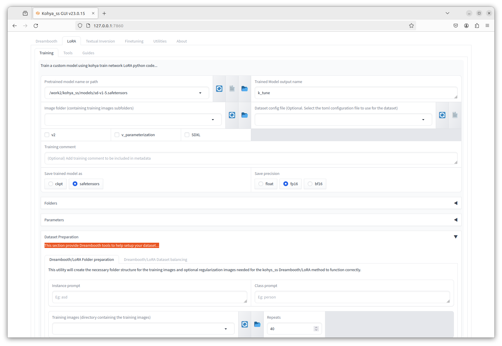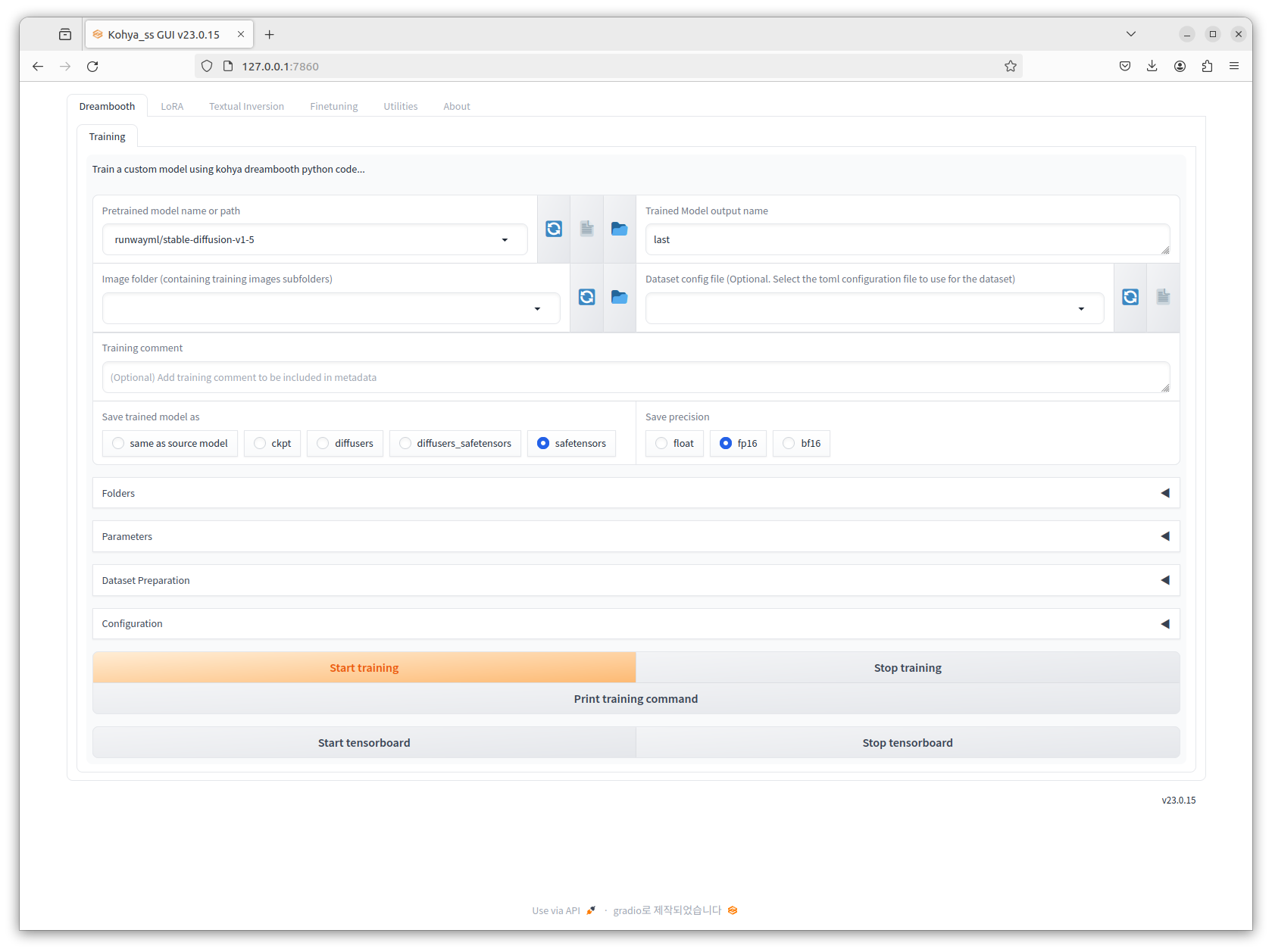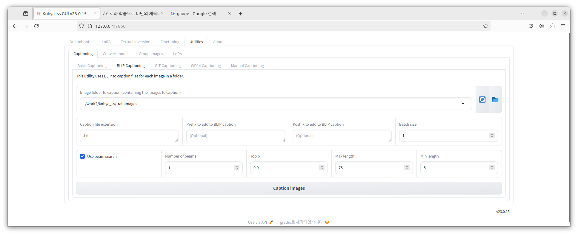 드디어 kohya_ss의 web UI가 뜬다.