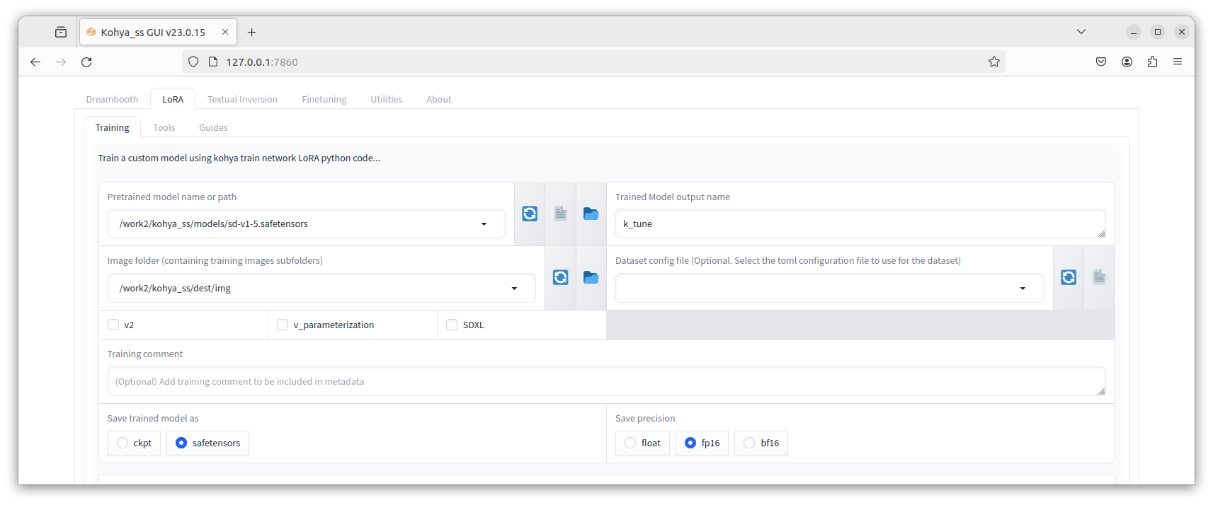 그리고 맨 상단의 Pretrained model name은 적절히 기본 모델을 선택하자. 여기서는 sd-v1-5.safetensors 를 복사해두고 적용했다. 이 모델은 Stable Diffusion 유명한 기본 모델이며. 다른 모델을 써도 당연히 된다.