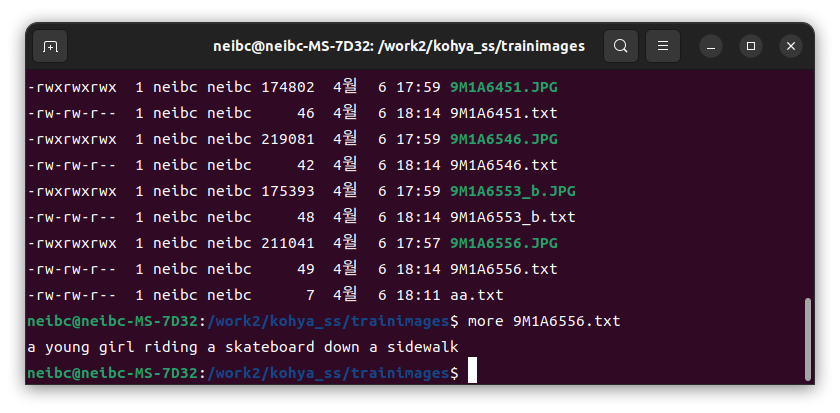 아래와 같이 Utilities->Captioning의 BLIP Captioning에서 image folders를 선택 한 후 맨 오른쪽 아래 Caption Images를 실행한다. 해당 폴더에 이미지와 같은 이름의 txt파일이 생겼음을 알 수 있다.