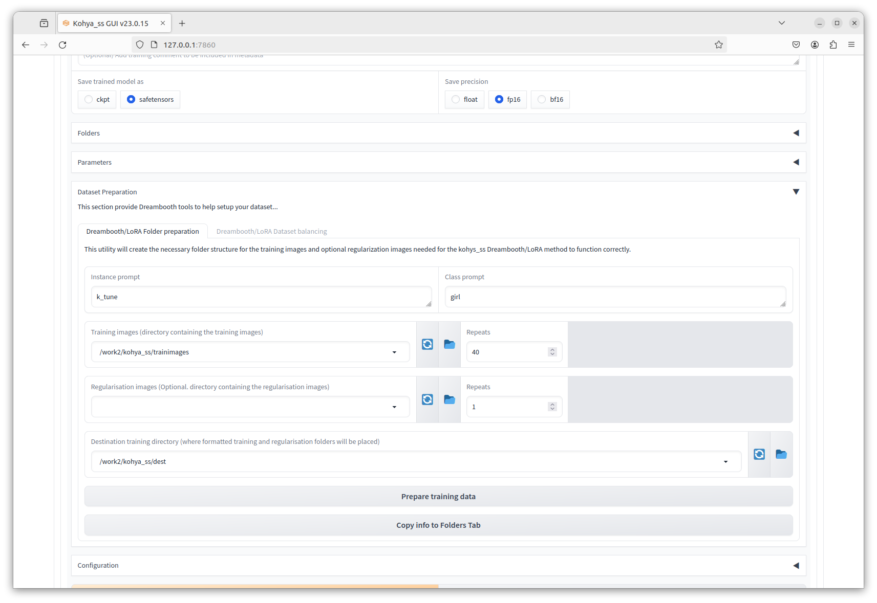 그리고 차례로 하단의 'Prepare training data'버튼과 'Copy info to Folder Tab'버튼을 각기 차례대로 누르면, 학습할 이미지가 해당 destination folder로 이동되어 준비되고, 이 설정들이 상단의 Traing정보로 복사된다(캡춰 화면에서는 보이지 않는 위쪽에 반영된다)