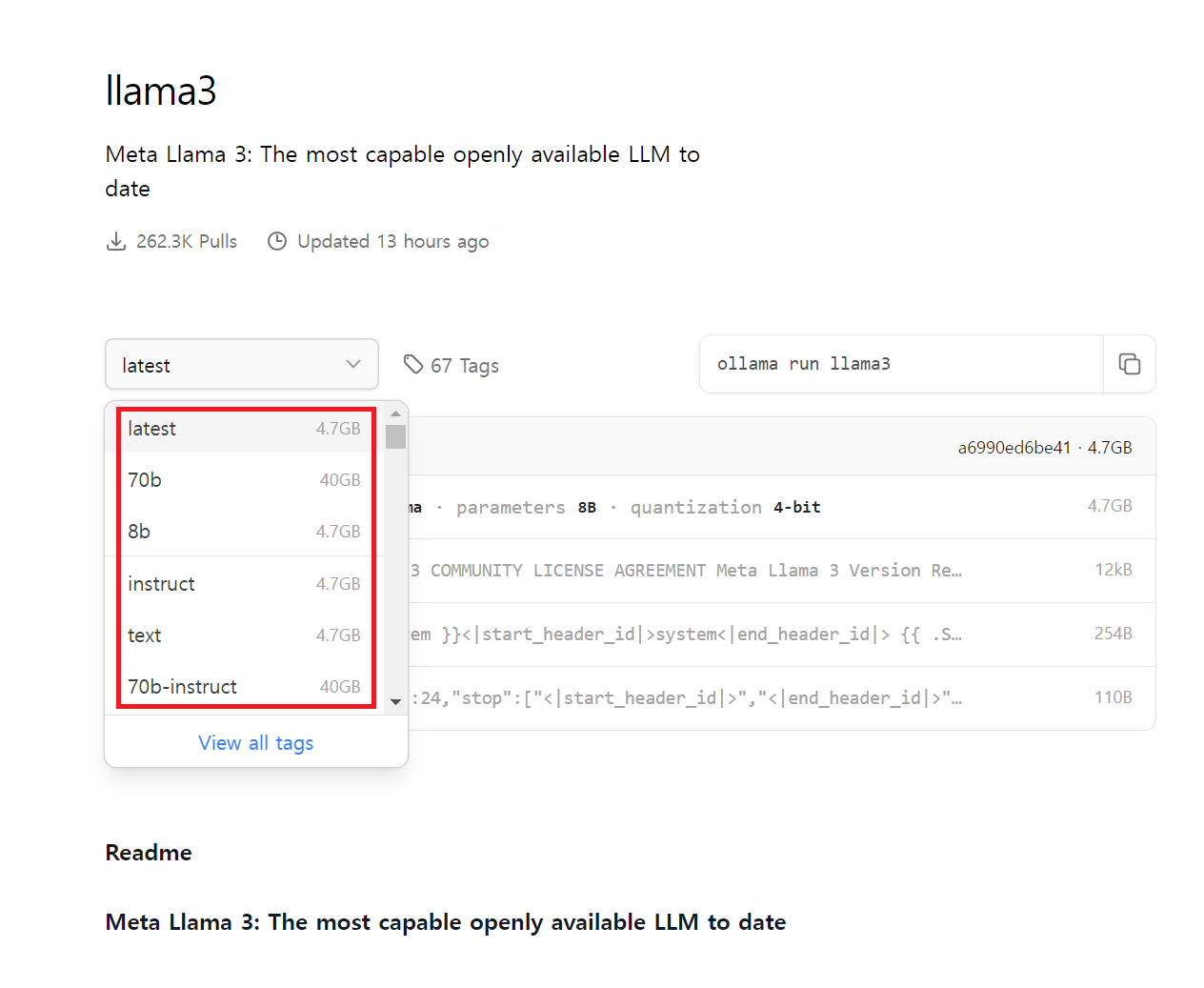 참고로 $ ollama run llama:70b 형태로 70B모델도 구동도 가능하다. 아래 각 모델의 세부 정보를 통해 어떤 형태까지 구동할 수 있는지 태그명을 알 수 있다.