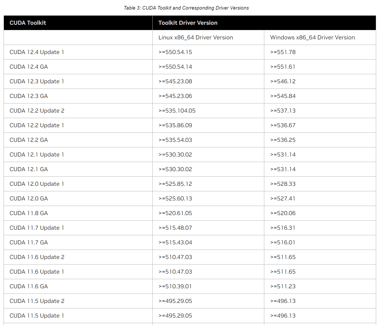 즉 어느정도 Driver 버전 이상이 되어야, 최근의 CUDA 버전이 지원된다. Linux와 Windows가 조금 다른 것에 주의하자.
