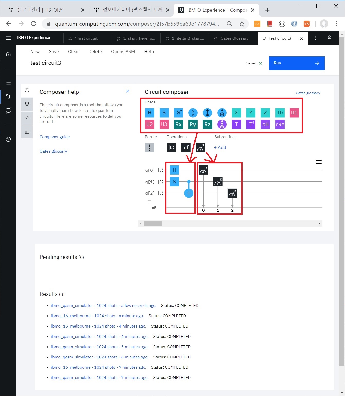 이런 게이트 들을 사용해 Circuit Composer에서는 GUI로 회로를 구성해서 실행해볼 수 있다. 간단하게 상태만 바꿔주는 엉터리 게이트로 회로를 구성해서(Gate를 끌어당겨 하단의 qubit들의 경로에 놓아두며 된다. 그리고 측정값을 얻기 위해 qubit 3개의 값을 c5로 내려놓는다.) Save한 후 상단 오른쪽의 Run을 눌러보자.
