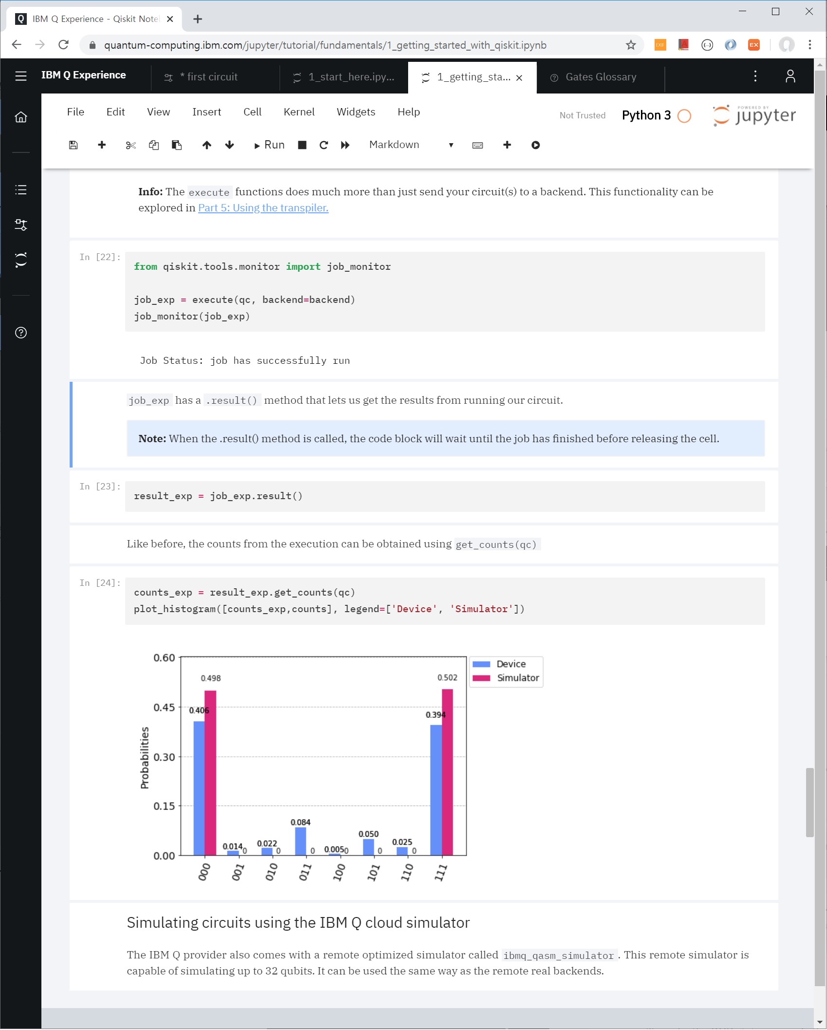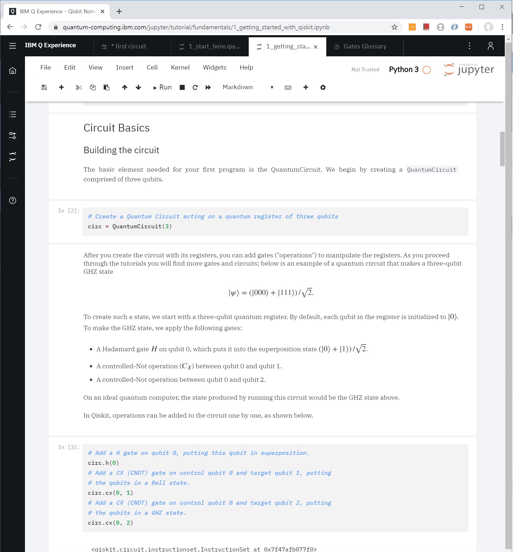 큐빗을 3개 할당하고 각 큐빗에 역시 게이트를 코딩으로 선언해주고 지속 진행한다(아래 사진, jupyter notebook이라는 웹기반의 python code를 실행하면서 살펴볼 수 있는 환경이다.)