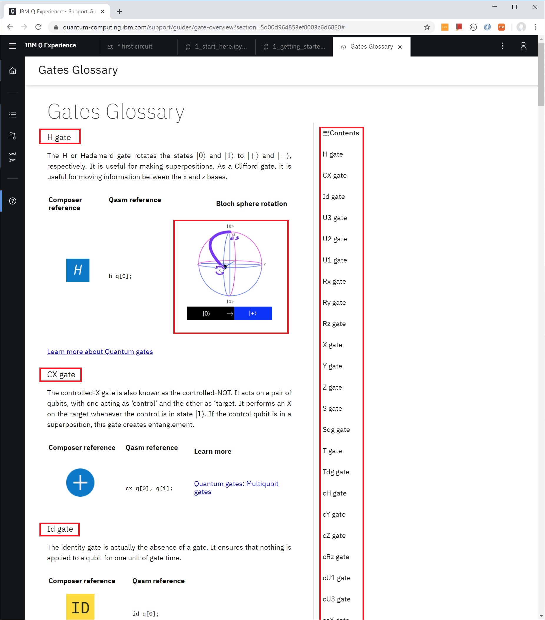 왼쪽의 세부메뉴나 링크(Circuit Composer의 링크를 통해서도 들어갈 수 있다)를 통해 Gate Glossary 문서를 살펴보자. 양자 컴퓨팅의 연산 게이트는 AND, OR, NOT 같은 것들이 아니라 H, CX, Id, U1, U2, U3, 같은 것들이 존재한다(양자 상태 변환이 단순 bit연산보다는 더 다양하다). 이것들은 양자 상태를 반전하거나 이동하는 등 다양한 것들이겠다. 스크린샷을 한번 보자.