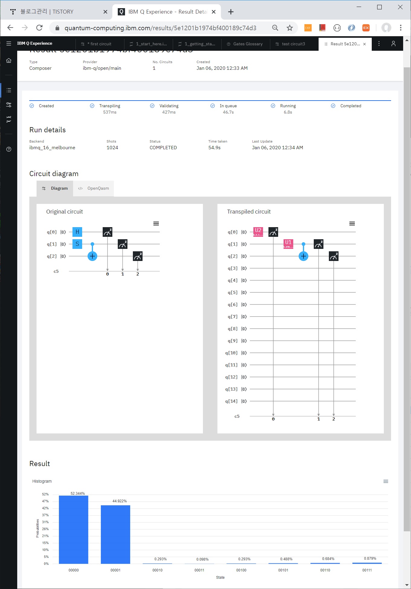 그러면 화면 맨 하단에 작업이 할당되었다는 메시지를 볼 수 있고 수초 이후에 Results 칸 아래에 결과가 나온다. 각기 결과를 눌러보면 아래의 화면과 같이 나온다. 이 실행 결과는 15 qubit짜리 양자컴퓨터가 할당되어 1024번을 수행하고 난 후 각 qubit상태별 조합의 빈도수(1024번중 각 케이스가 얼마인지의 비율 형태로)를 보여준다. 해당 State 케이스 숫자(00000~00111)의 맨 오른쪽이 0번 qubit이므로(역순으로 배치된다) 00000, 00001 즉 000과 001이 거의 절반씩 나왔다. 처음의 q[0]의 상태가 50%쯤 반전되었고, 나머지 q[1], q[2]는 사실 큰 변동이 없으니 맞는 결과다. (00000형태로 qubit이 5개인 것으로 나왔는데 뒤 3가지 qubit만 본 것이다. qubit 3개만 할당했는데 왜 5개로 배열되었는지는 잘 모르겠다. 여하튼 무시하면 결과는 맞다.)