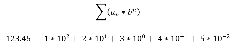 이 표기법을 수학적으로 나타내보자면 특정 수를, x의 제곱들로 덧셈 분할한다. 대략 아래 표현식을 보면 이해할 수 있다.