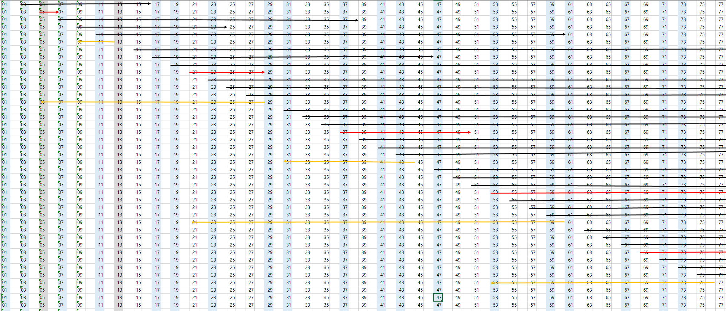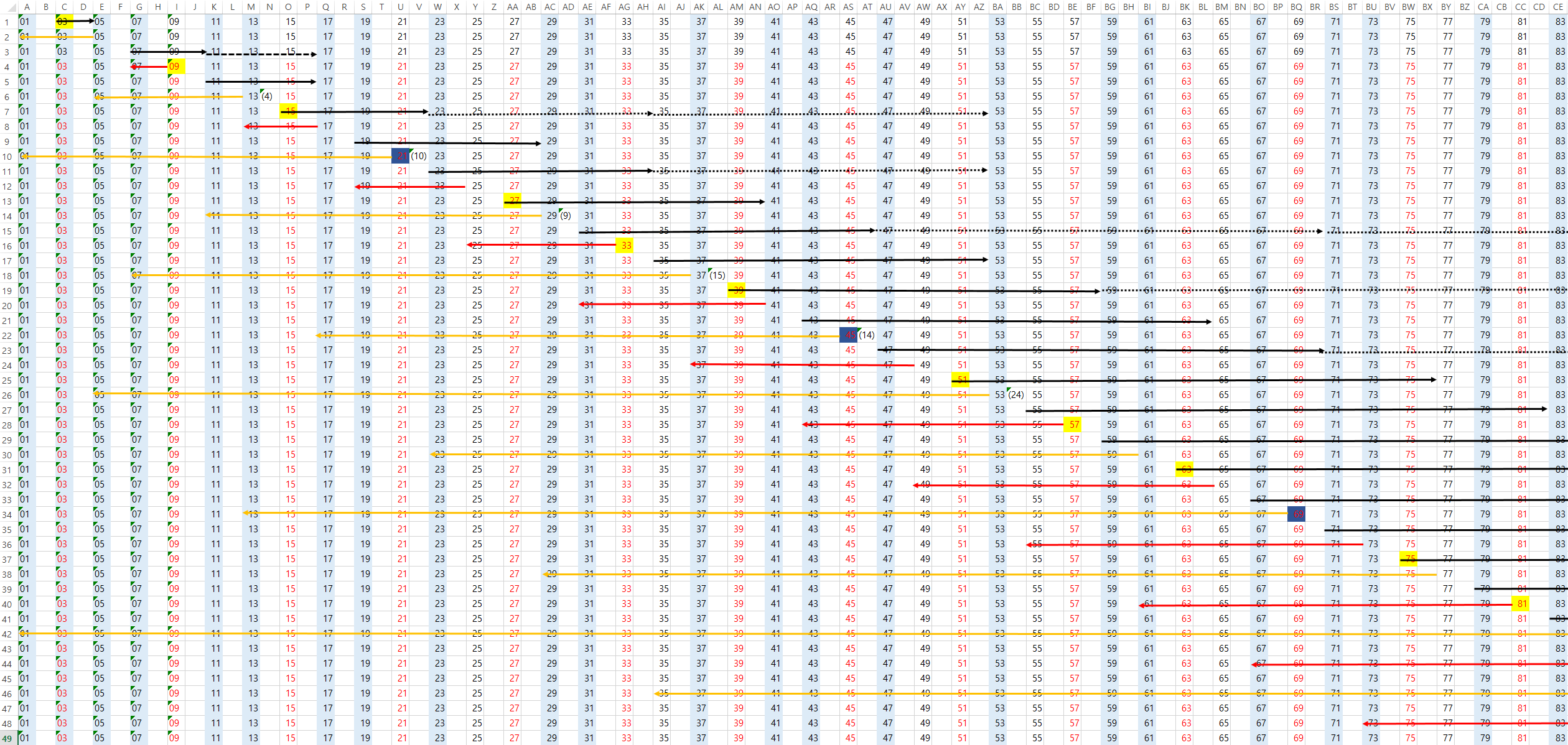 초등학생도 이해할 수 있는 문제이기 때문에, 아이들과 같이 이야기하다가 도움이 될 수 있는 만한 정보를 확보하여 기록해 둔다. 상기 계산을 숫자별로 계속 반복한 다이어그램이 바로 아래와 같다.