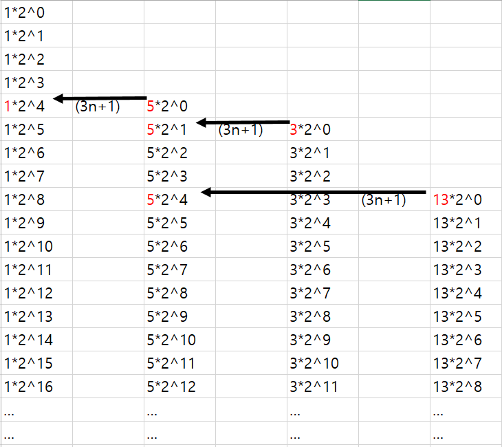그런데 이 그림을 조금 계량해 보면, 이 문제를 더 단순화 할 수 있다. 어떻게? 특정 홀수들의 2의 x제곱을 각각의 줄로 나열해놓고 표기하는 방법이다. 이렇게 되면 해당 줄에 들어서면 나누기 2를 반복해서 결국 그 홀수로 귀결된다. 그러면 그 홀수에서 3n+1로 jump하는 식으로 구성할 수 있다.