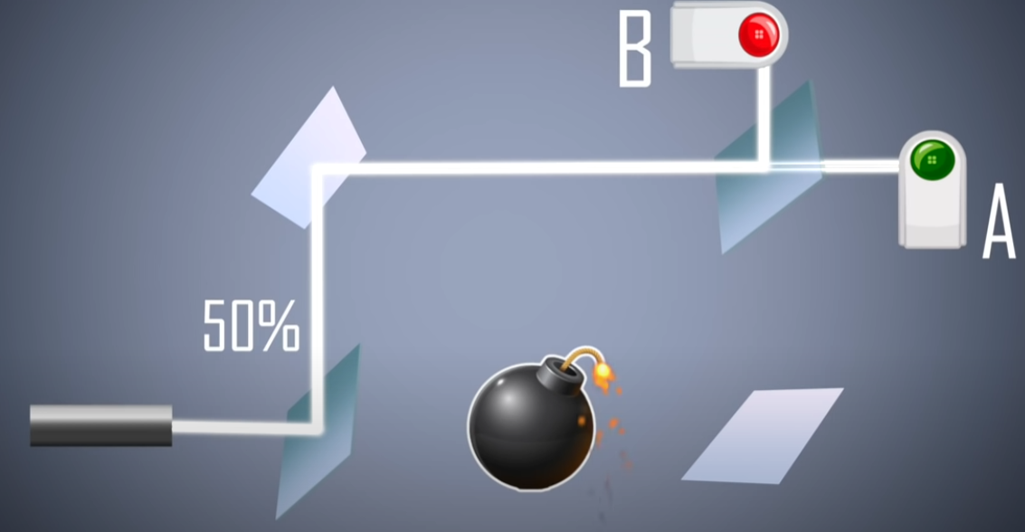 전체적으로는 50%의 확률로 폭탄이 터지거나(그 길로 광자가 지나가거나), 아니면 폭탄이 터지지 않고 B나 A로 각각 25%의 확률로 감지되었을 경우가 생긴다. 그런데 어떤 광자를 쏴서 B가 감지되었다면 무슨 의미인가? 광자는 분명히 폭탄 근처에도 가지 않았는데 그 폭탄이 켜져있고 거기 있다는 것을 알려준다. 아래 영상에서의 마지막 그림이 그 사실을 말해준다.