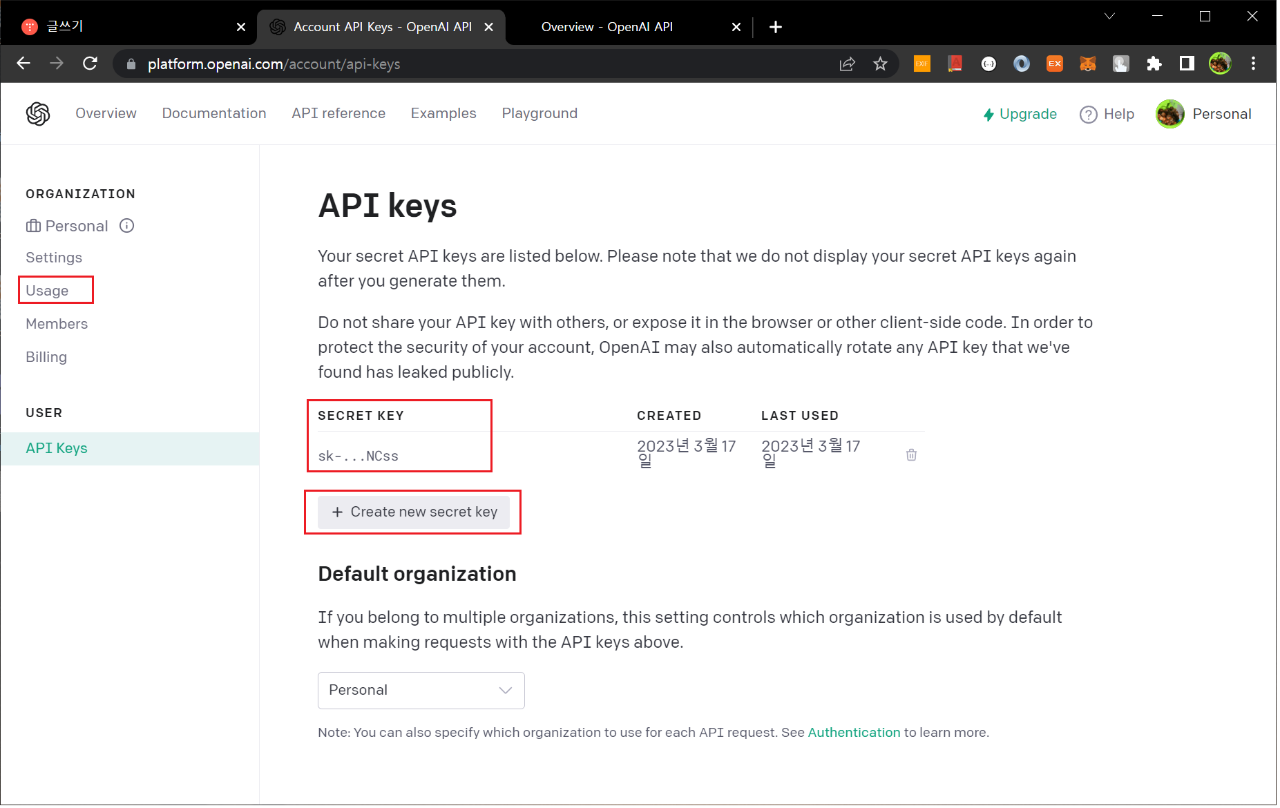 0) 우선 OpenAI의 API를 사용하기 위해서는 API key를 받아야 한다.
