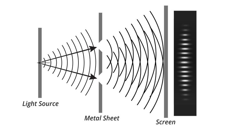 토마스 영의 이중 슬릿 실험(1801년)은 빛이 입자로 여겨지던 상황에서 파동으로 확정되는(당시 기준으로) 결정적인 증거가 되었는데, 아래 그림이 가장 간단한 설명이다.