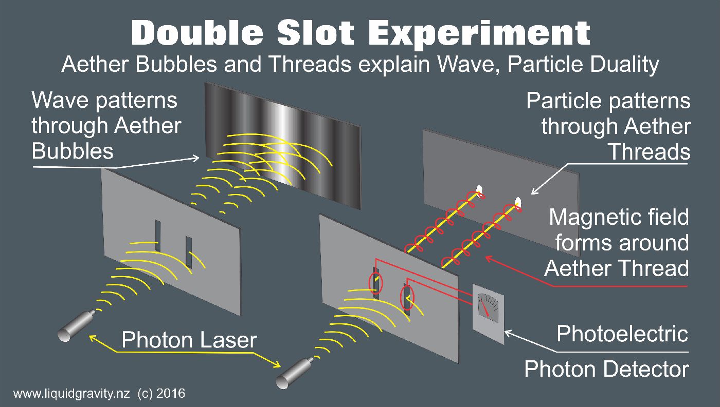 그런데 빛이 입자라면 어떨까? 아래의 그림에서 오른쪽에 있는 것처럼 두 줄이 나와야 한다. 왜냐하면 말 그대로 직진하는 입자이기 때문이다. 곧장 얇은 틈으로 날아가서 분명하게 두개의 영역에만 표시된다. 뭔가 슬릿에 반사되는것 아닌가? 싶을 수도 있겠으나 그 모양도 물결무늬와는 거리가 있다. 그저 두개의 밝은 영역과 나머지 어두운 영역이 되어야만 한다.