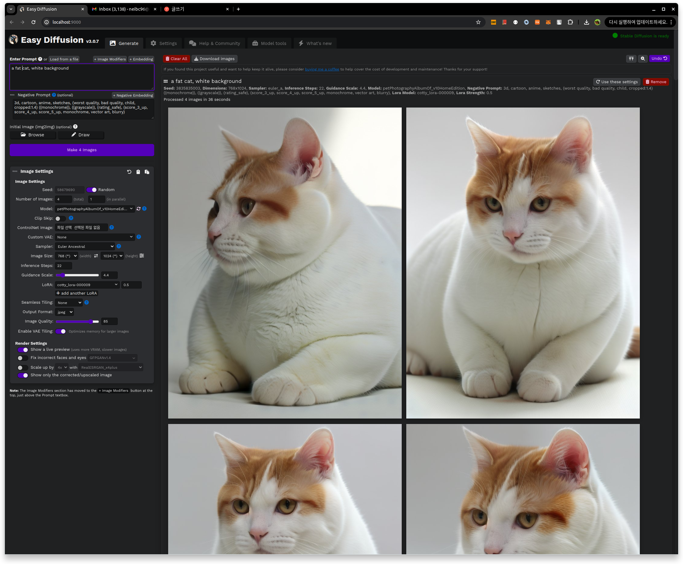 4. Easy Diffusion을 통해 Lora를 구동한다. 단순한 합성과 다른 것은, 프롬프트를 통해 여러가지 효과를 줄 수 있다
